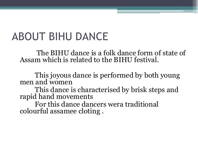 Write A Short Note On Bihu Dance - This movement has aesthetic and symbolic value, and is acknowledged as dance by performers and observers within a particular culture.nb 1 dance can be categorized and described by its.
